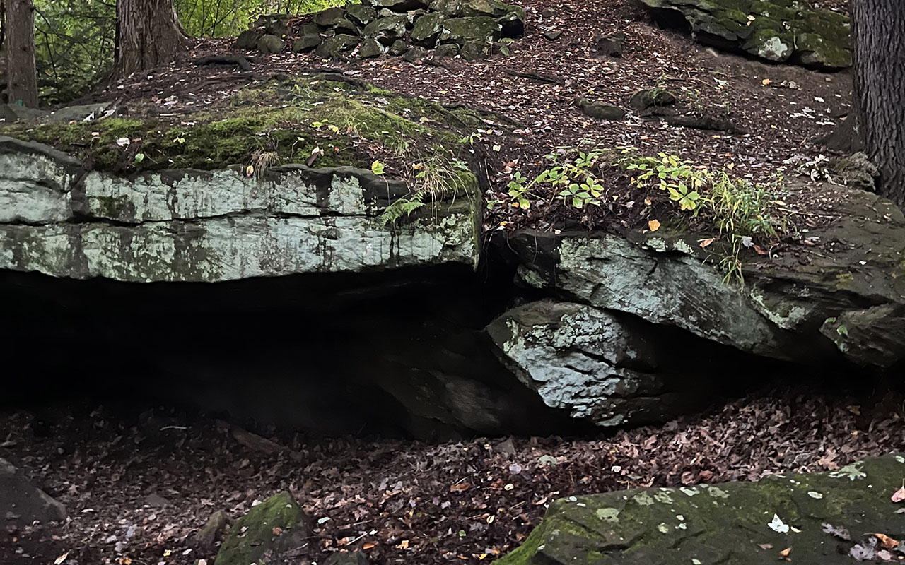 Water flowing in Bears Den Run undercut the existing sandstone until pieces broke off and tumbled into the creek. The entire ravine area was carved out by erosion. (Julie Geiss photo)