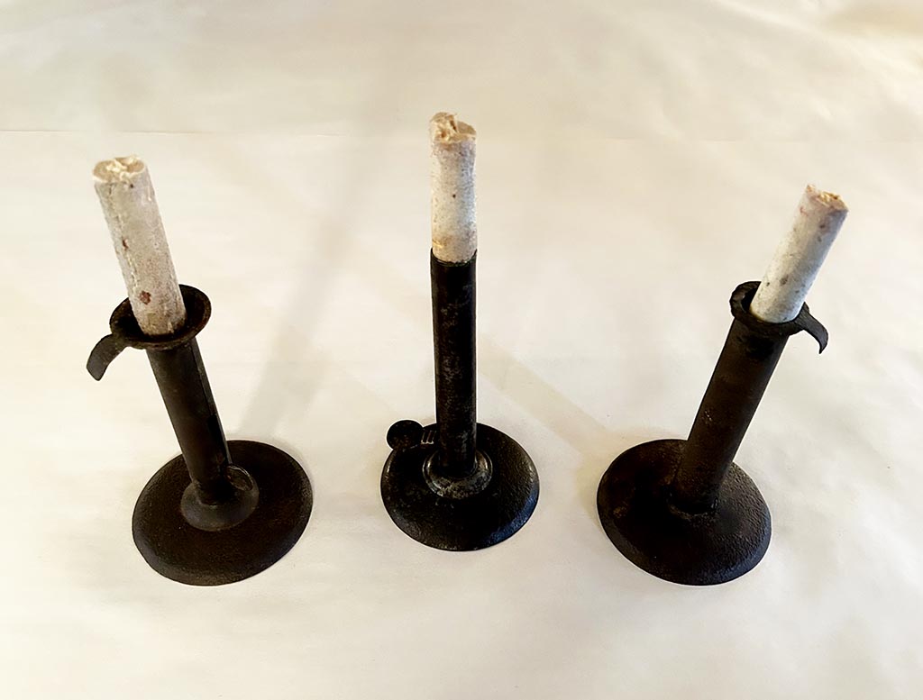 One of the very few multi-tools on the frontier was the hog scraper candlestick. The handle could be used to hold a candle, while the base doubled as a scraper. Some had small hooks on the rim that allowed them to be attached to the top rail of a chair or the edge of a mantel. (Locher collection)