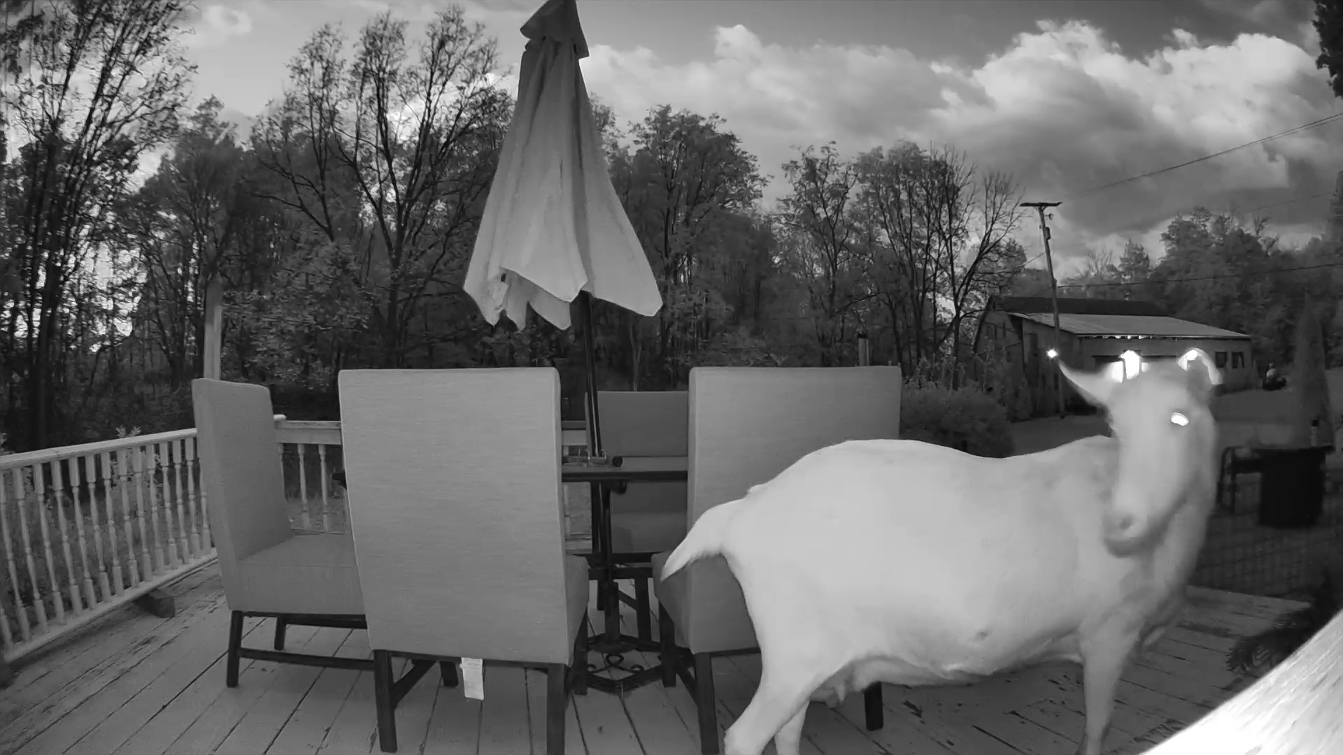 Lo and behold I was treated to a view of our goat, Buttercream, strolling across the back deck — nary a care in the world. She even looked back toward the camera as if to say, “whatever.”