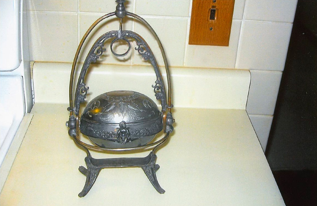We’re going to show Item No. 1053 another week. Jennie Cline, of Woodsfield, Ohio, shared the item, and adds it’s silver metal, and stands 12 inches high, and measures 6 1/2 inches across. You open it by holding on to the metal angel, then pulling up on the top to close it.