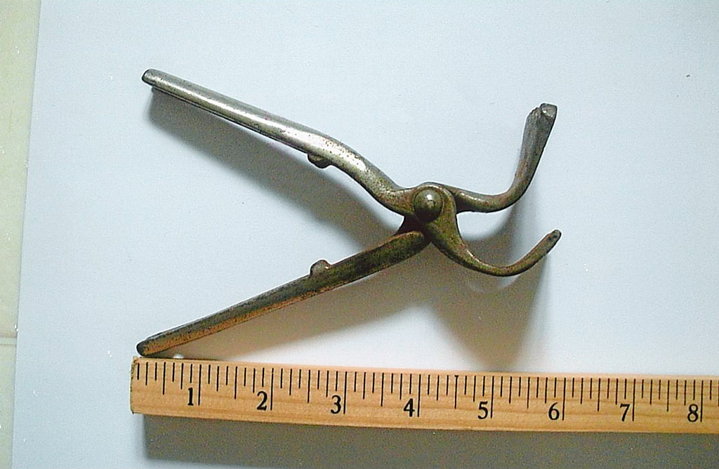 Our new item comes from Dick Kind, of Slippery Rock, Pennsylvania. We’re showing two photos of different angles. There are no markings on the tool, which the Kinds found in a shed on their farm and don’t know how it was used. There is a 3/8-inch hole located a half inch from the end, on the bottom side.