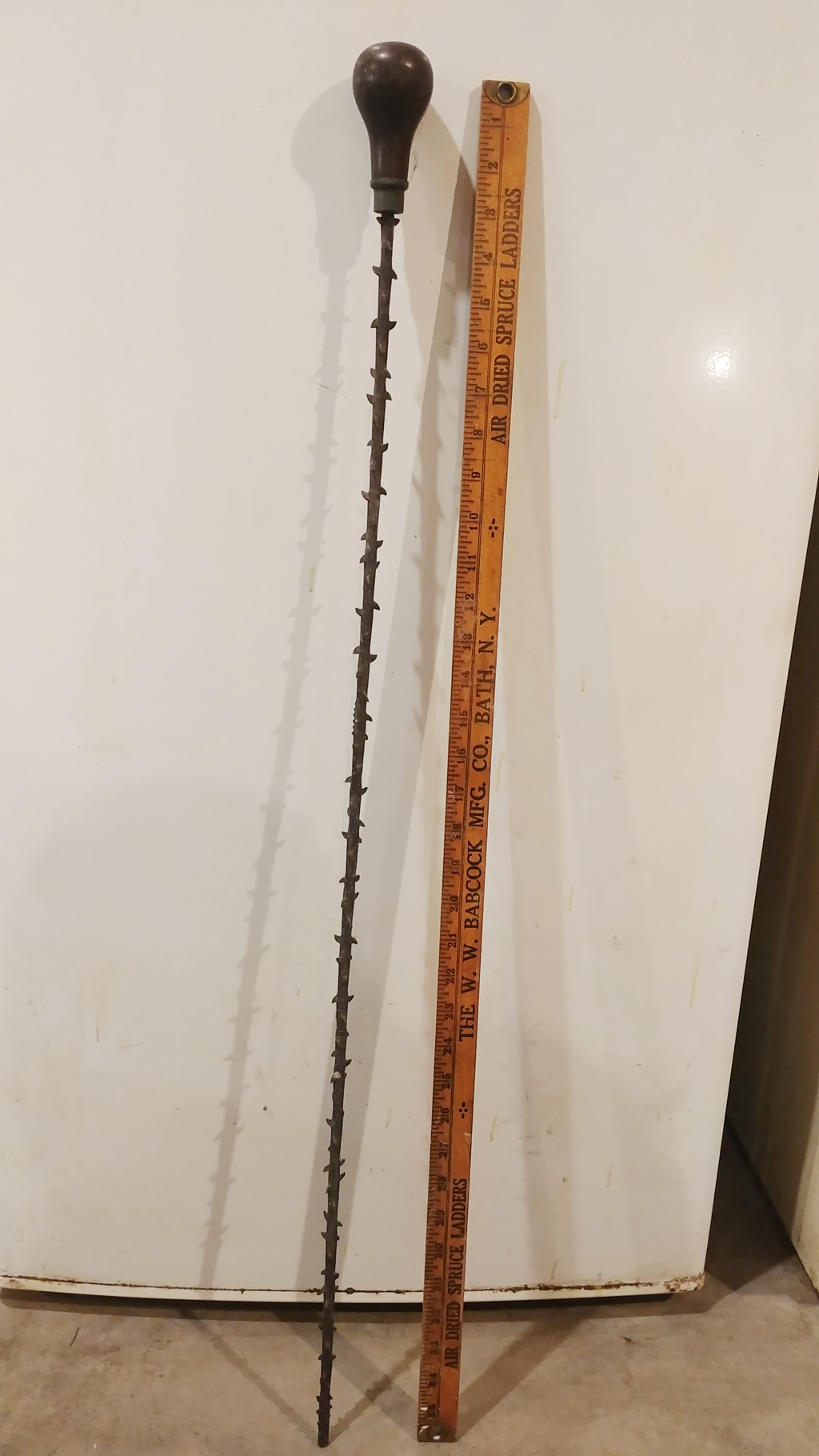 Item No. 1102 comes from Bob Brown, of Ellwood City, Pennsylvania, who found it in a shed. It’s right around 3 feet long, with alternative teeth that are attached to a quarter-inch rod. There is a wooden handle, much like you would find on a brace and bit drill.