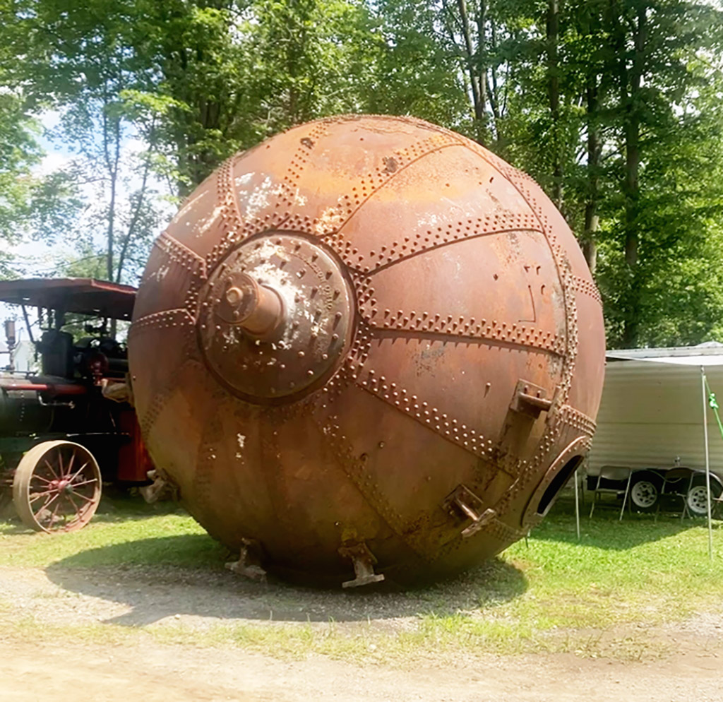 Item No. 1283 was submitted last summer by Calvin Breyley, of Streetsboro, Ohio. He saw it at a steam show in Geauga County in July 2024. He wrote that there was nothing telling people what the giant metal ball was or what it was used for. He noted that the sphere had “an identical hole on the opposite side of the ball.”