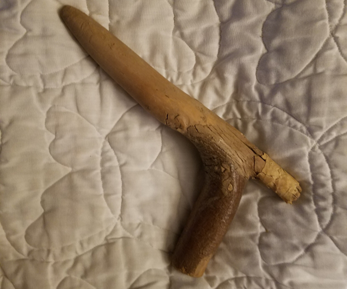 Brent Hill submitted Item No. 1241. He writes that it appears to be a piece of wood in the shape of a toy gun, but it is actually a tobacco peg used for hand planting. This would have been the main tool for planting before the invention of the mechanical planter, and then after, for those who could not afford a planter.
