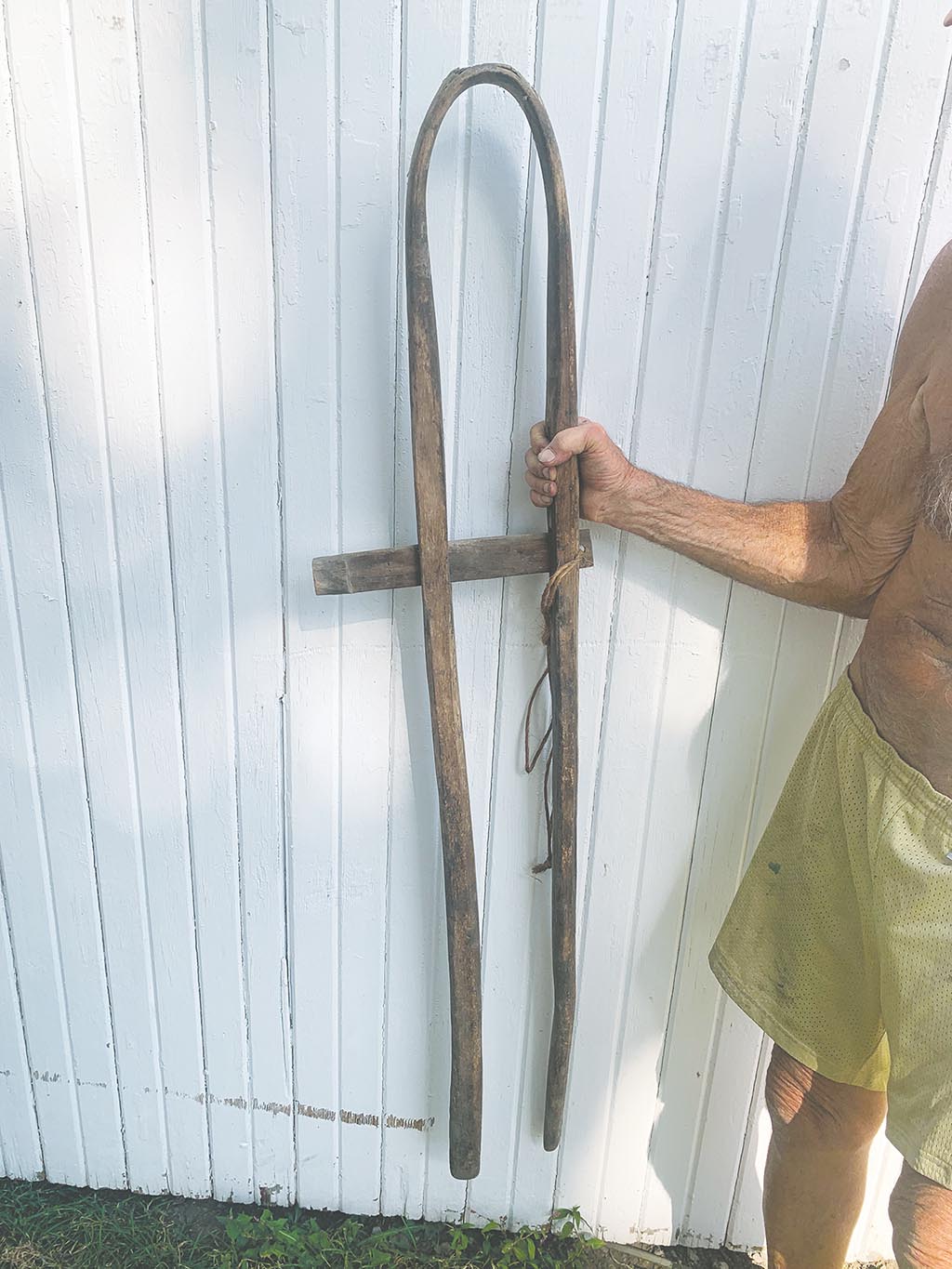 We are introducing a new item this week, Item No. 1299. This one comes from WJ McChesney, of New Galilee, Pennsylvania. It’s a wooden item with two long skinny arms, about 4-feet-long, rounded at the top, with another piece of wood that sits perpendicular across the two sides. That’s all I got. Does anyone recognize this item?