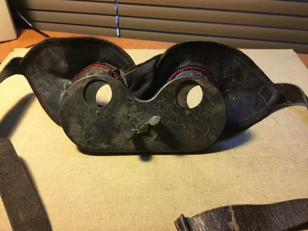 Item No. 1072 comes from Linda Bertanzetti, Columbiana, Ohio, who recently found these “goggles” in a box. They are leather and steel, lined with red fabric (against the face). The picture is upside down to show the metal cones that encase the eyes. She writes the wing nut on the top opens and closes the viewing hole, and an adjustable leather strap holds the piece tightly to the head.