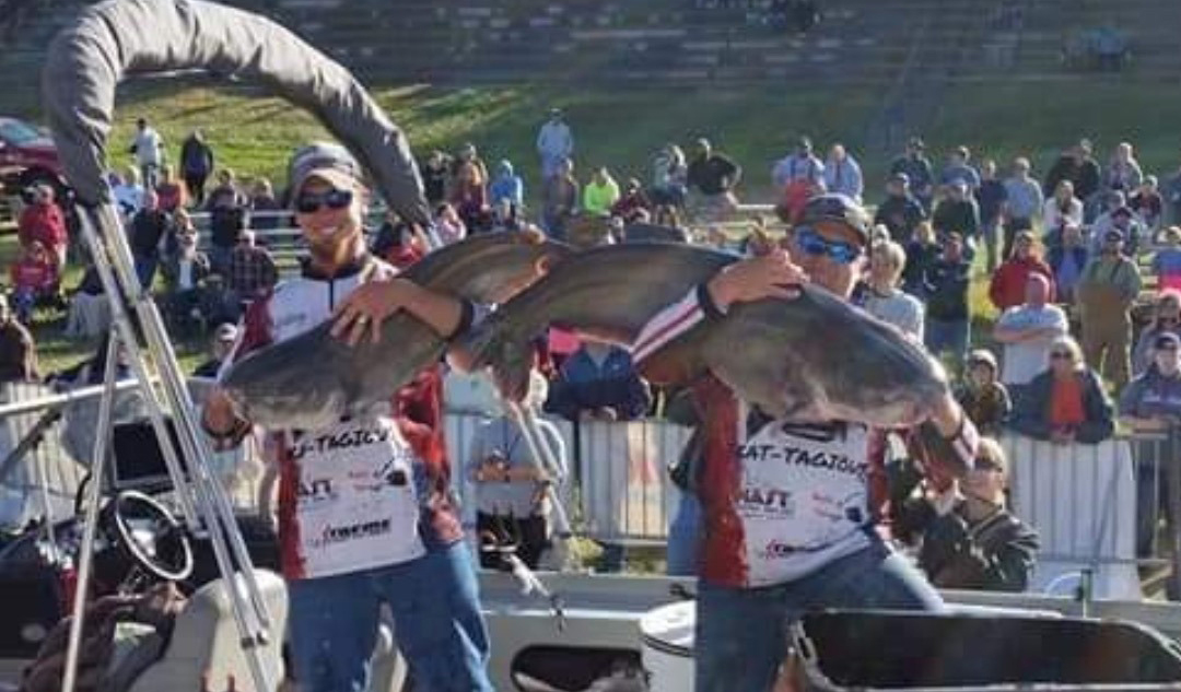 Anthony Murphy, left, and team partner Mike Snyder hold their best two blue cats as they are announced winners of the Monsters of the Ohio, a premier national catfish tournament. (Submitted photo)