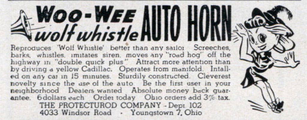 And, although exhaust whistles had been around since the ‘teens, wolf whistles were all the rage when I was a kid and a couple of my buddies had these gadgets on their cars. The wolf whistle (which is still available) screwed into the car manifold and when a pull cable to the dashboard was manipulated, a loud, ear-piercing whistle resulted. With a little practice, the sound could be made to imitate the time-honored salute given to a pretty girl (yeah, we were sexist back in those unenlightened days).