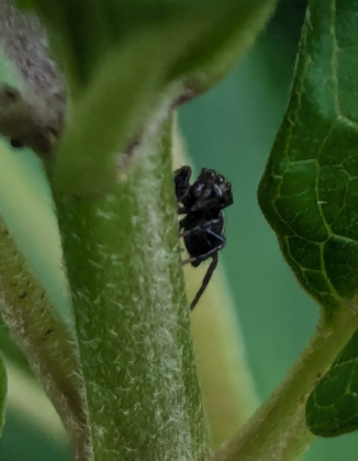 While mowing one day, I first noticed on top of one of the narrow lance-shaped leaves a tiny black speck about the size of half a grain of rice moving. As I idled the mower next to the plant to further examine this wonderment, it jumped and hid around on the opposite side of the plant’s stalk.