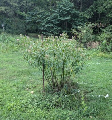 Asclepias incarnata, the swamp milkweed, is a perennial plant native to this part of the world; it thrives in the heavy clay soil that abounds here too. Its flowers are less showy, not as fragrant and smaller than common milkweed, but its defining quality is the rose-purple-colored flowers that grace the plant in later summer.