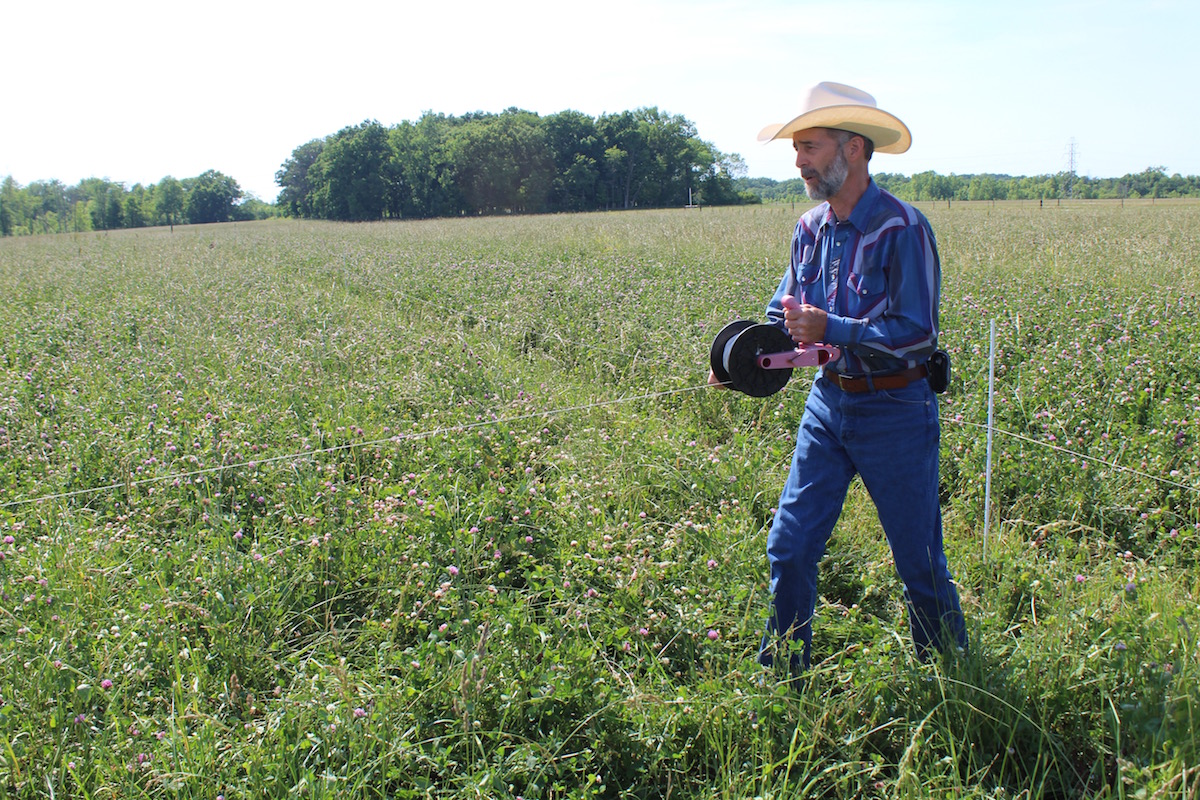 Sam Short reels up wire so his herd of cattle can move into a new section of pasture, at their farm near Archbold, Ohio, June 17, 2020. (Rachel Wagoner photo)