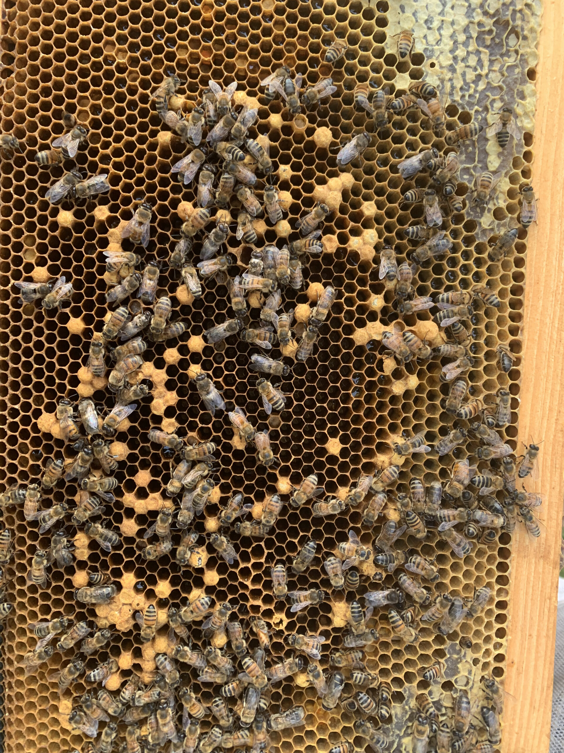 These pheromones stop the workers from developing ovaries and becoming functional. This may take up to a week or more, depending on the conditions of the hive, but without any young brood or eggs available, the hive will become “droney”.