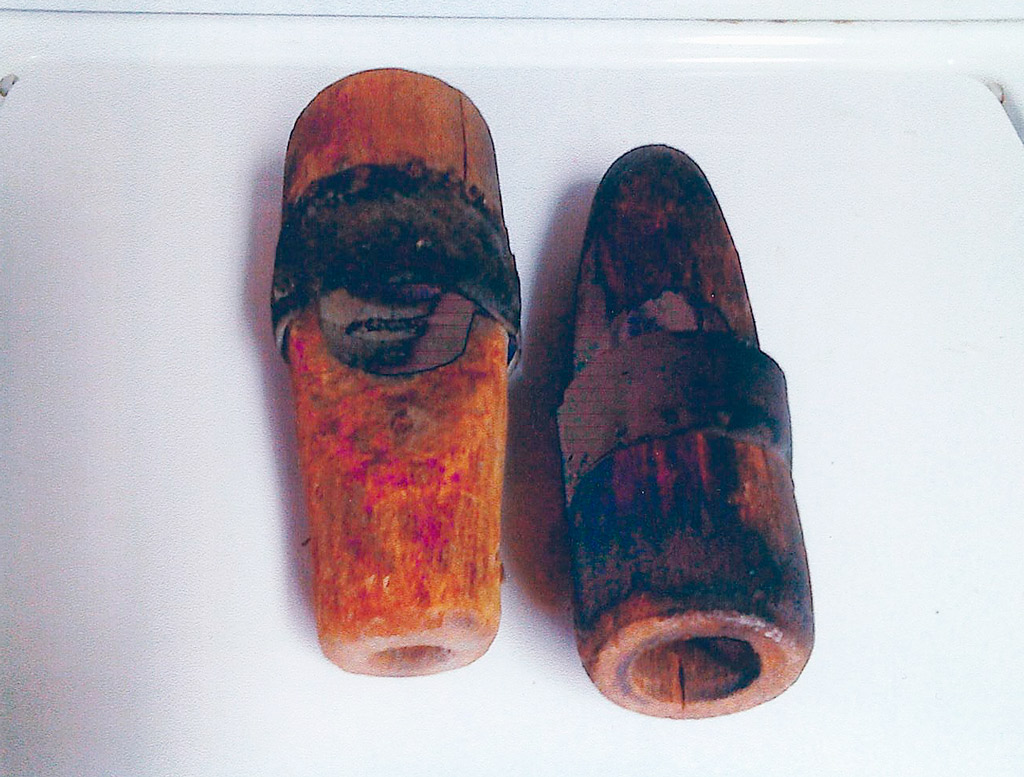 Item No. 1061, our next item to test your skills, comes from James Turvey, of Mechanicstown, Ohio. They’re both the same item, but one measures 2-1/2 by 8 inches; the other is 3 by 8-1/2 inches. They’re both made of wood and leather, with tacks holding the leather in place.
