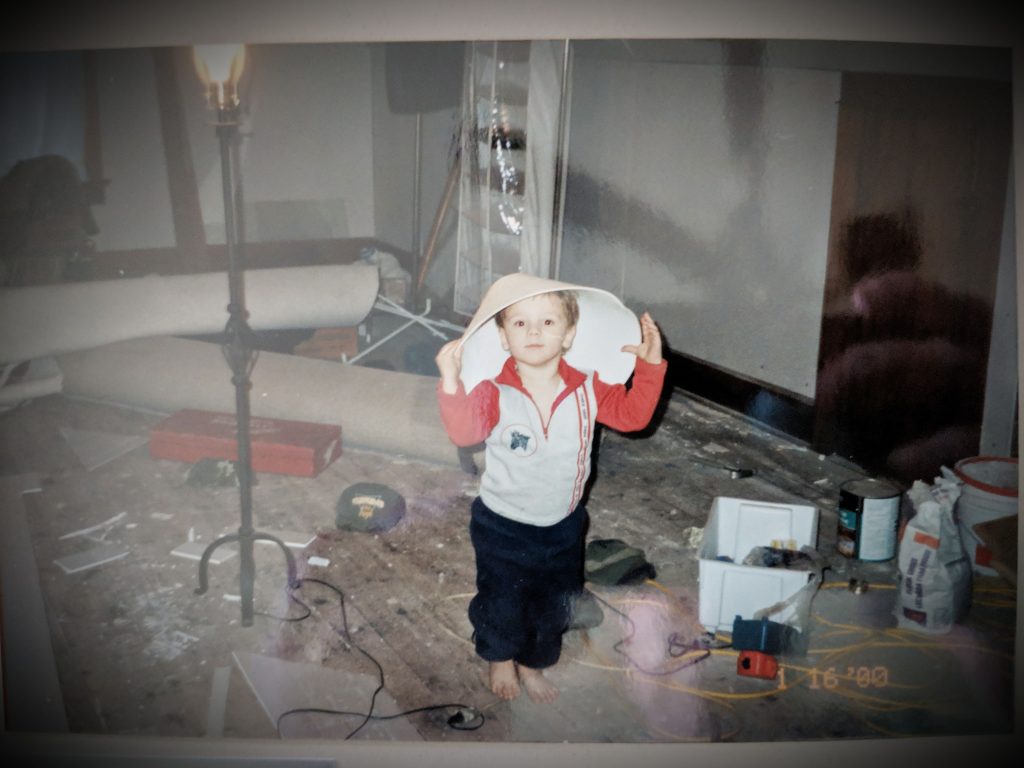 In this photo, he is also wearing a lampshade on his head, as you do. I feel that no photo captures his childhood quite so beautifully. Chaos, construction debris, and a few laughs.