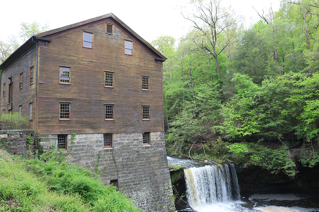 The current structure is the third mill built along Mill Creek, built in 1845 and then restored in 1982-1984. The lower levels are made of cut sandstone forming the foundation; the upper levels are covered with natural siding. Water flows under the replicated covered bridge and then plunges 23 feet over layered rocks.