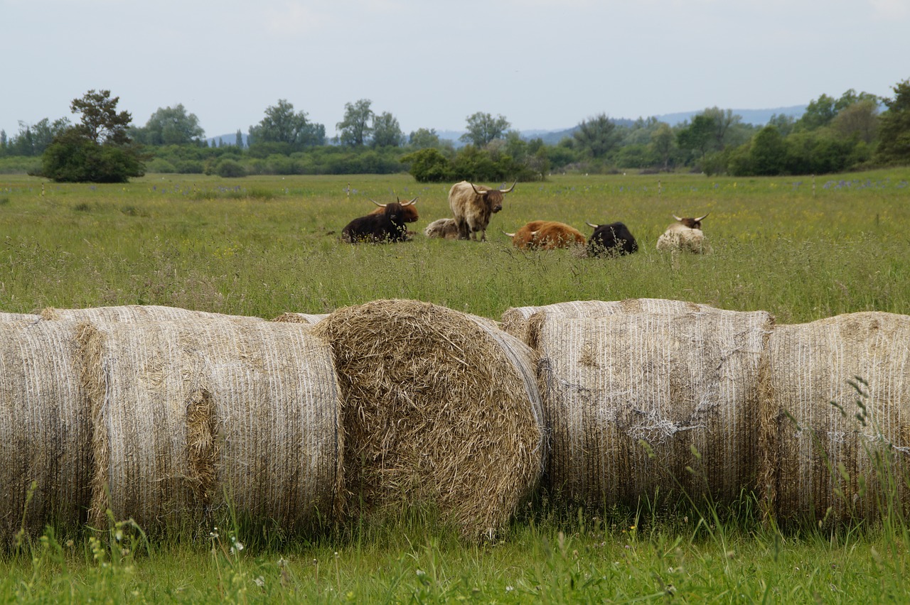 cattle and bales of hay on pasture