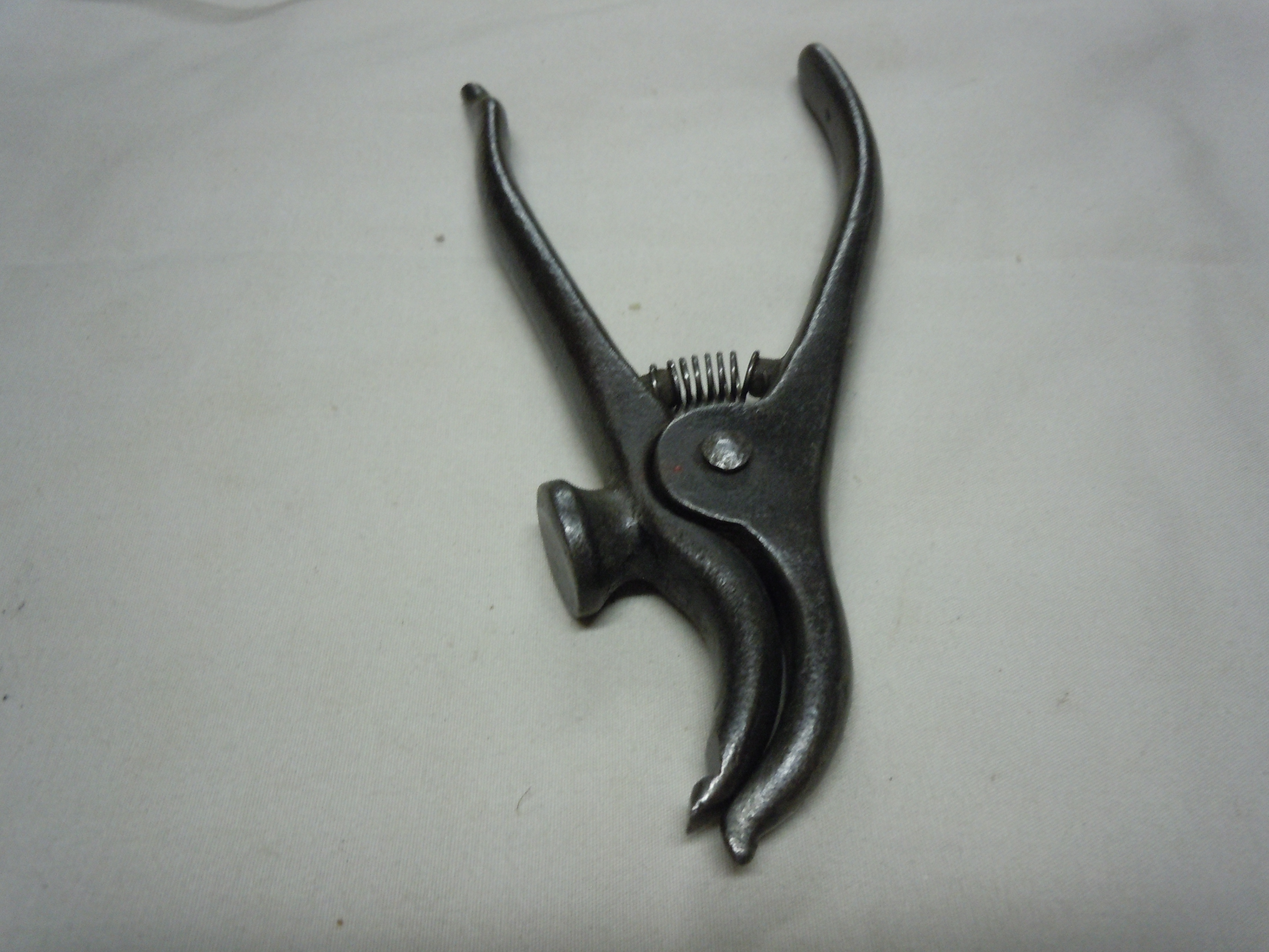 George H. Wimer, of Tidioute, Pennsylvania, believes it is a bottle caper. The portion with the yoke shaped area is grooved to fit around the ring on the glass beer or pop bottle just below where the cap fits. The cap is placed on the top of the bottle and the handle is pushed down to lock the cap in place.