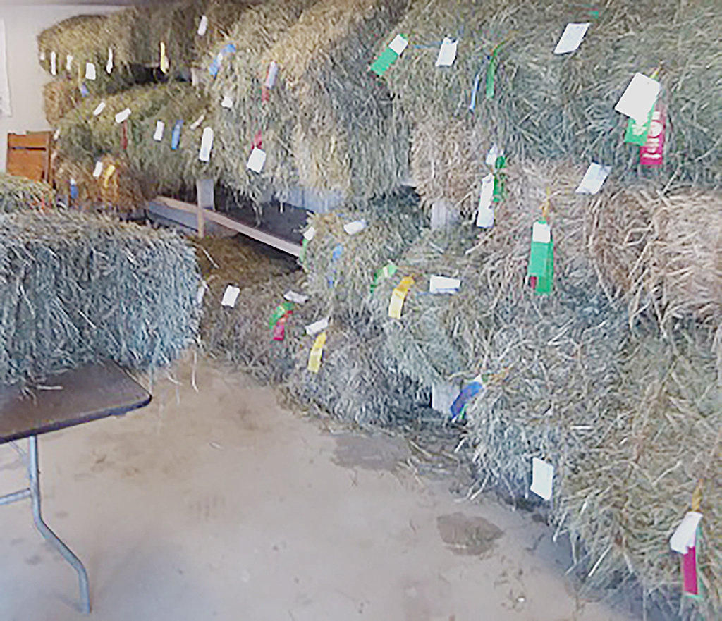 Prize-winning bales of hay are stacked and dotted with bright ribbons at the Medina County Fair hay show. (Submitted photo)