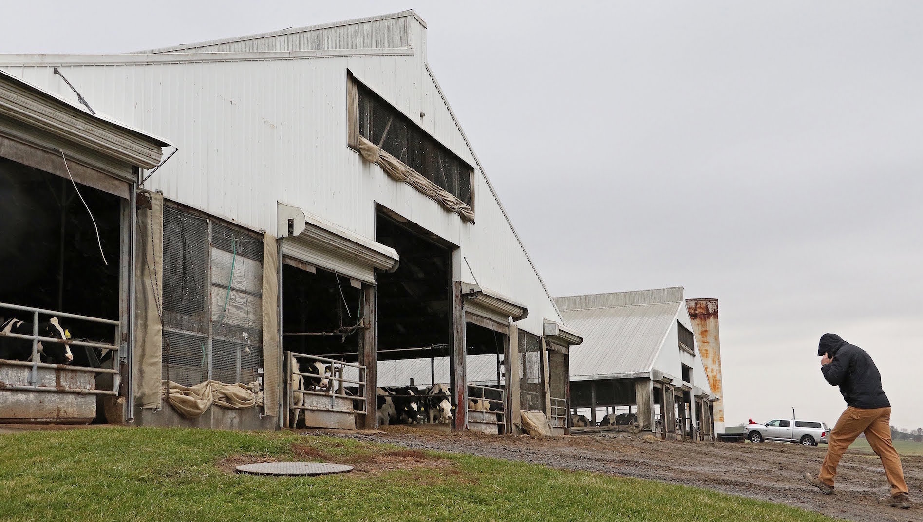 man walking into barn