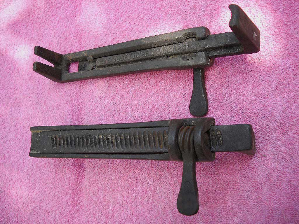 Here’s how we described it back in 2010: “The cast iron clamp-like tool measures 6-5/8 inches closed and 12-3/8 inches fully extended. It has two prongs 1-1/2 inches tall, one is claw-like and the other solid, with a slight concave surface. The lever closes with a 180-degree rotation onto a threaded surface anywhere along the traveler, tightening the clamp by one-eighths of an inch. There’s writing on the casting, ‘E.E. Josef Buffalo N.Y. Pat. Apr — (date unreadable)’.”