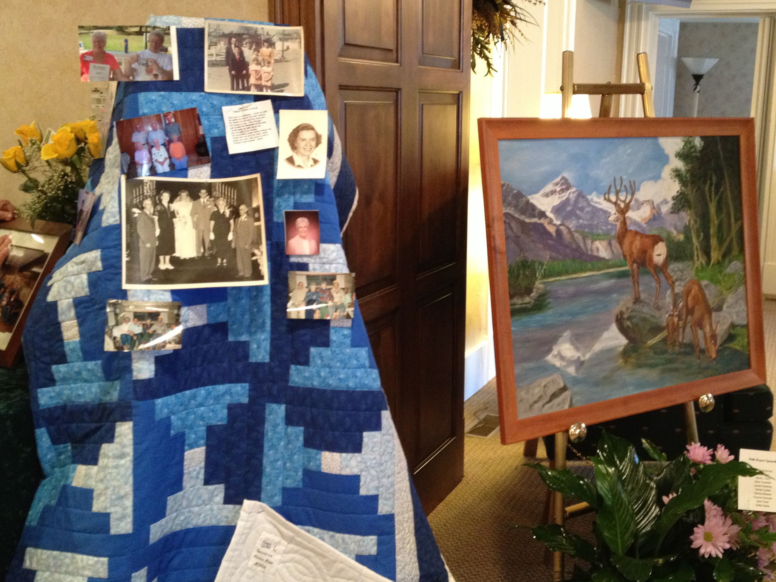 One wall is covered — and I mean covered — with her children and grandchildren’s wedding day photos, as well as black and white family photos of her siblings and Dad’s family. The other wall is dominated by a huge painting of a big buck along a mountain stream that she painted when I was young.