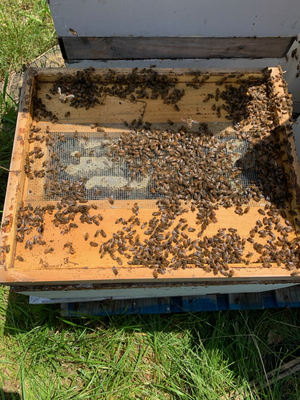 The double screen board is a wooden spacer that has open screen in the center to allow the lower hives’ heat to move upward and warm the split above it. This screen is placed between the two deep bodies, effectively making two hives with a shared bottom board and a shared cover. The double screen with the space between it is necessary so the bees in the two hives cannot touch and interact with each other and trade pheromones, thus effectively making it a separate hive with a separate opposite entrance. The heat generated from the lower original hive warms the upper hive and utilizes their heat to help keep the upper hive’s brood warmer.