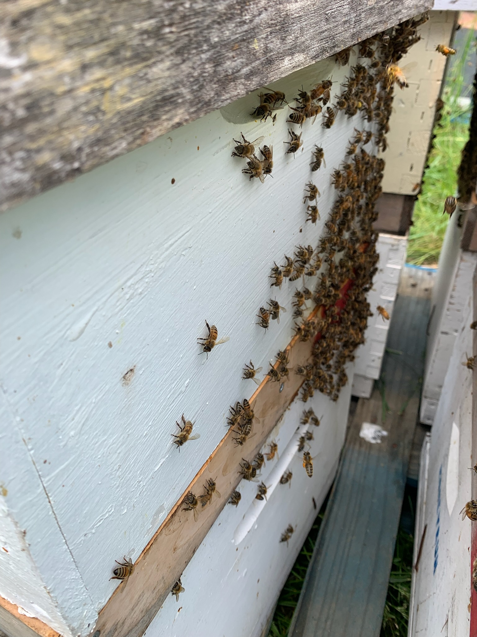 Always put in more bees in the new hive when splitting, because a lot of the foragers are out in the field. You may assume you are splitting too heavily in favor of the queen split, but there will be a lot of foragers returning in the evening to the original hive.
