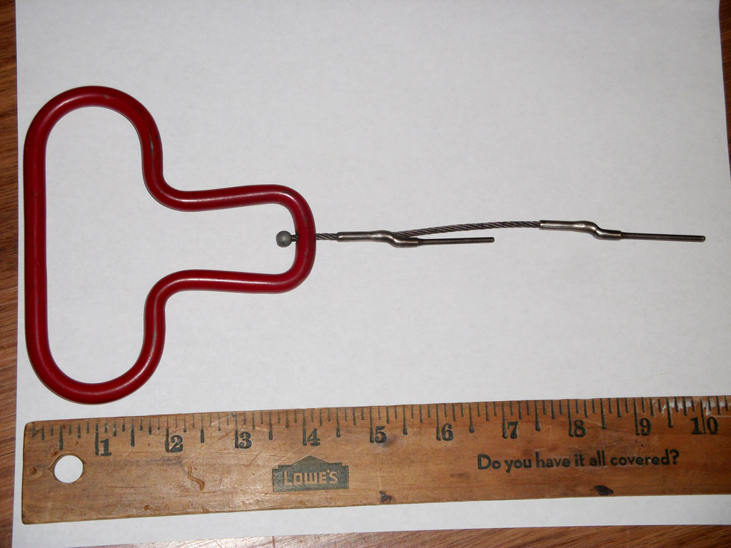 Willis Brubaker, Wooster, Ohio, submitted Item No. 1206. The tool came in a file full of manuals after buying a house. He has no idea what it is or how it was meant to be used. The tool is about 10.5 inches long including a sturdy handle connected to a cable with two offset probes. It looks like something you could pull on fairly hard.