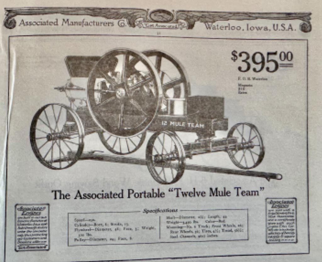 The engine I acquired from Paradise is a Twelve Mule Team, manufactured by Associated Manufacturers Company, with a homemade canopy.