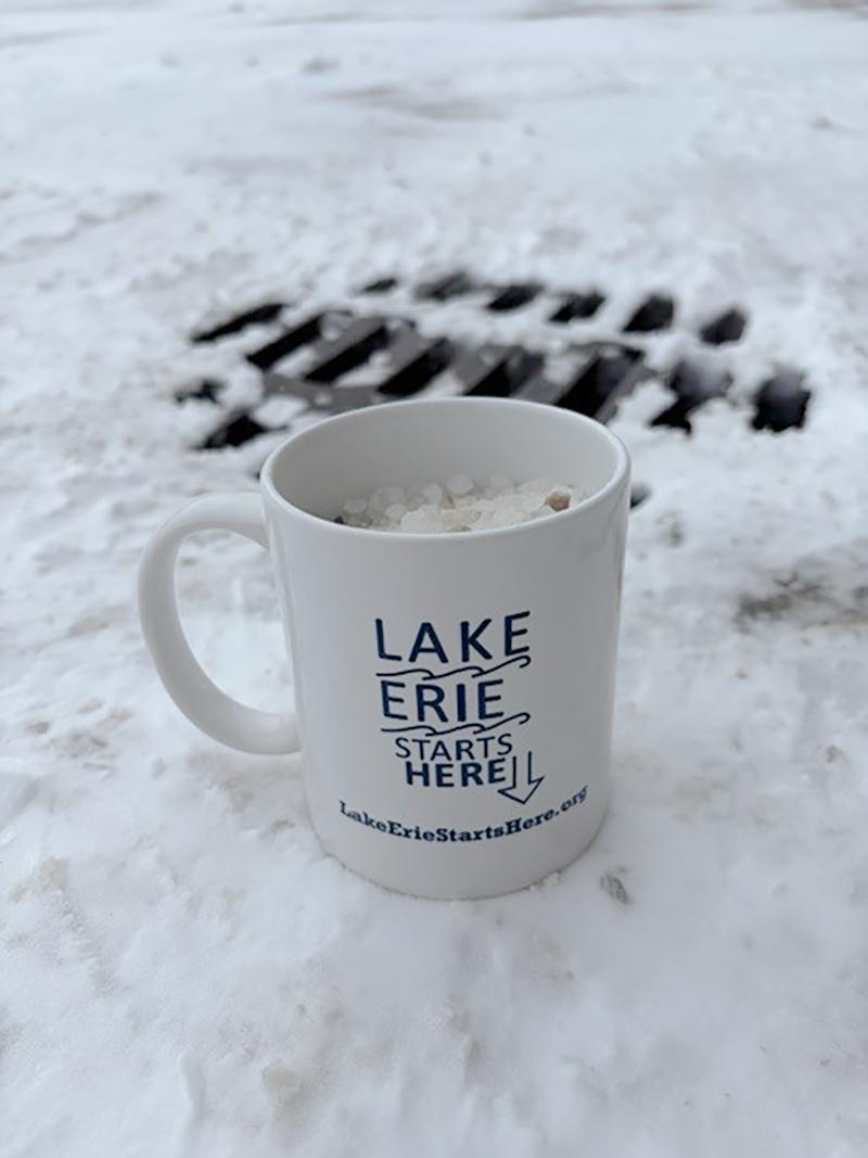 Salt from our roadways is now a pollutant to our waterways. It’s helpful to shovel and clear snow from your driveway and sidewalks before it turns to ice and if salting, spread sparingly. A 12-ounce coffee mug full of salt is enough to deice 10 sidewalk squares or 2 parking spaces. (Geauga SWCD photo)