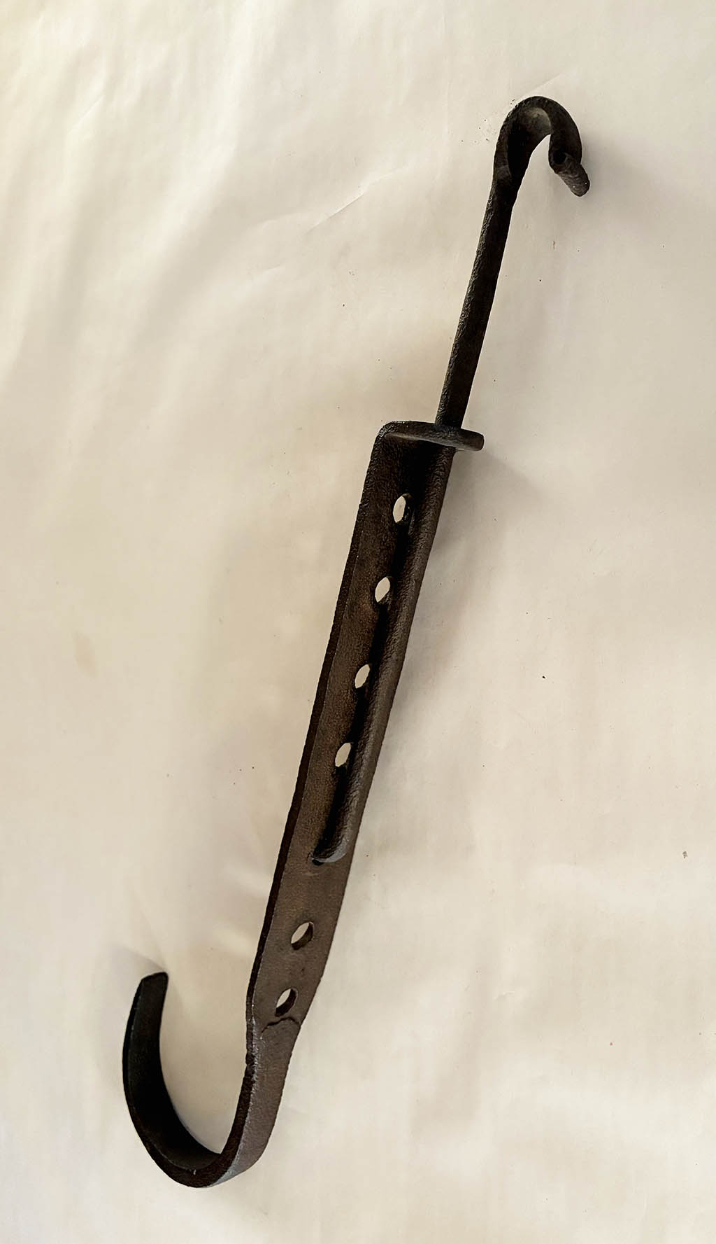 Bar trammels were made, as the name implies, from flat bars of iron into which numerous holes were punched. A second piece consisted of a round rod with a substantial pot hook on one end and a small hook to engage any of the various holes in the bar on the other. Thus, the pot hung on the hook could be moved up or down depending on which hole the rod was hooked into.