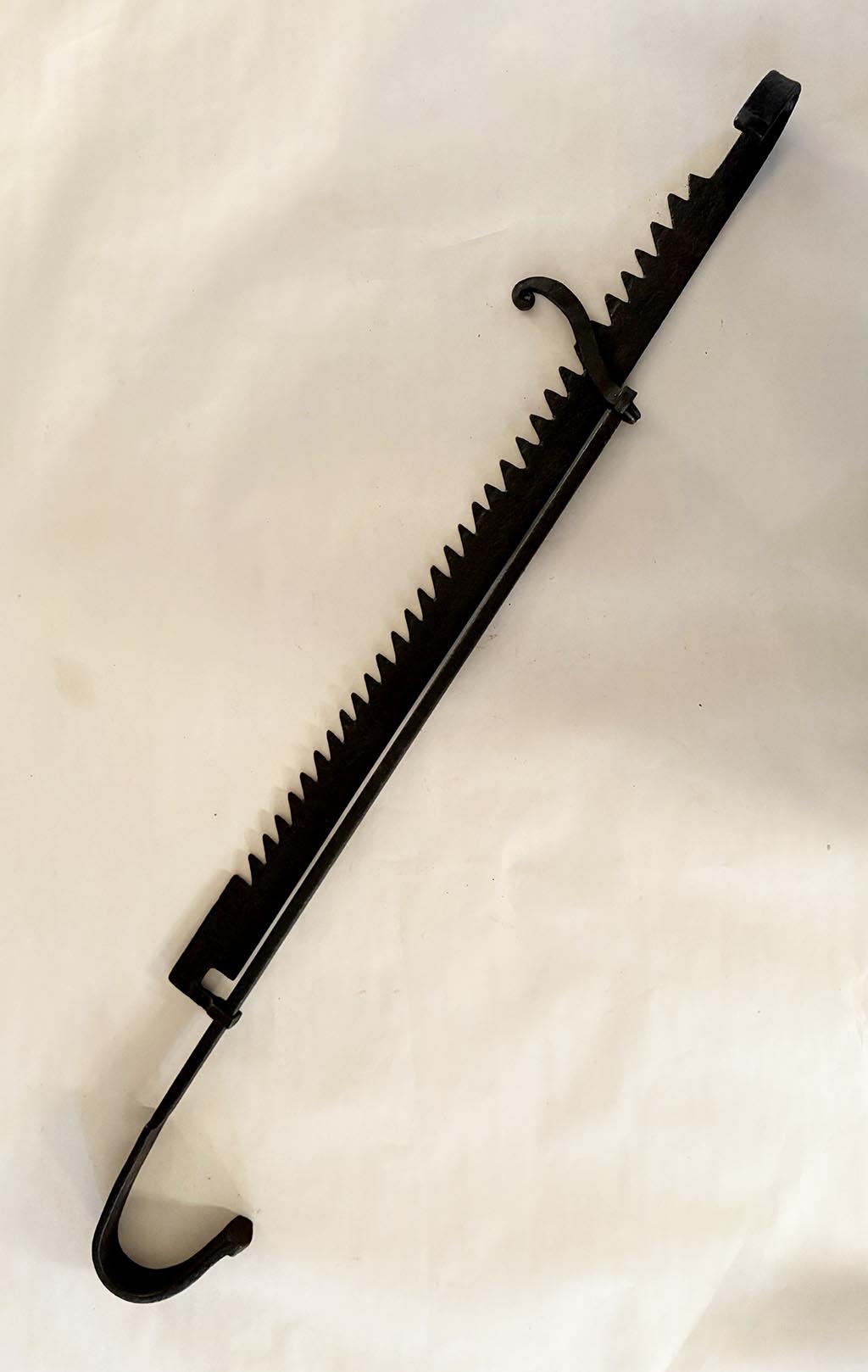 The third type was the sawtooth trammel, so named because of its resemblance to a saw with very large teeth. Having a lug pole hook at one end and a pot hook crafted on the other, the sawtooth trammel could be moved up or down on a rod, the teeth engaging an iron crosspiece when the pot was at the desired height above the fire.