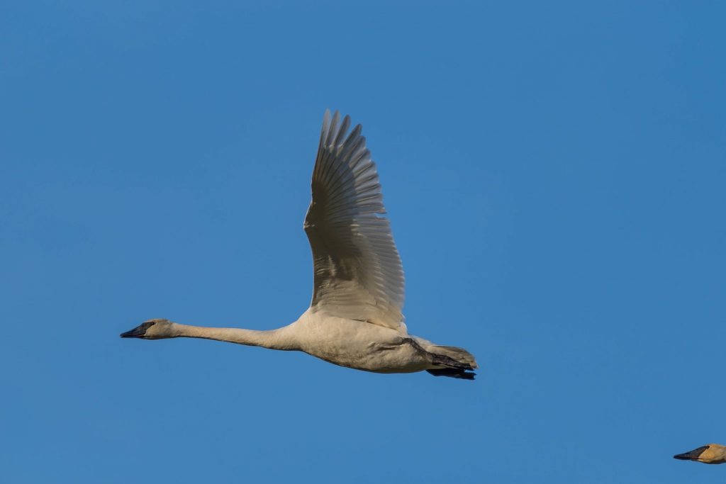 Another type of waterfowl that looks similar is the tundra swan. Slightly smaller with a yellow spot near its eye, it can be misidentified as a trumpeter swan.
