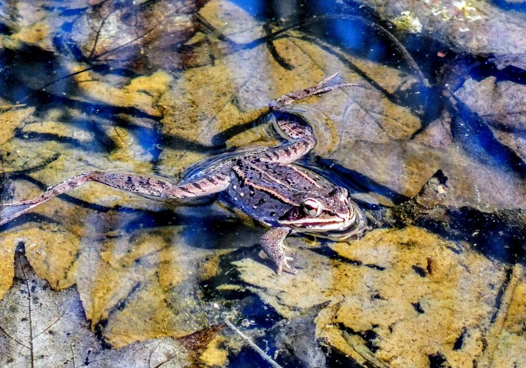 Wood frogs are among the earliest frogs to breed in the spring, and this male was using the vernal pool at the University of Mount Union’s nature center for that purpose. Characterized by black markings around the eyes that resembles a mask, and a white line above their lips, wood frogs have a mating call that is more of a quack.