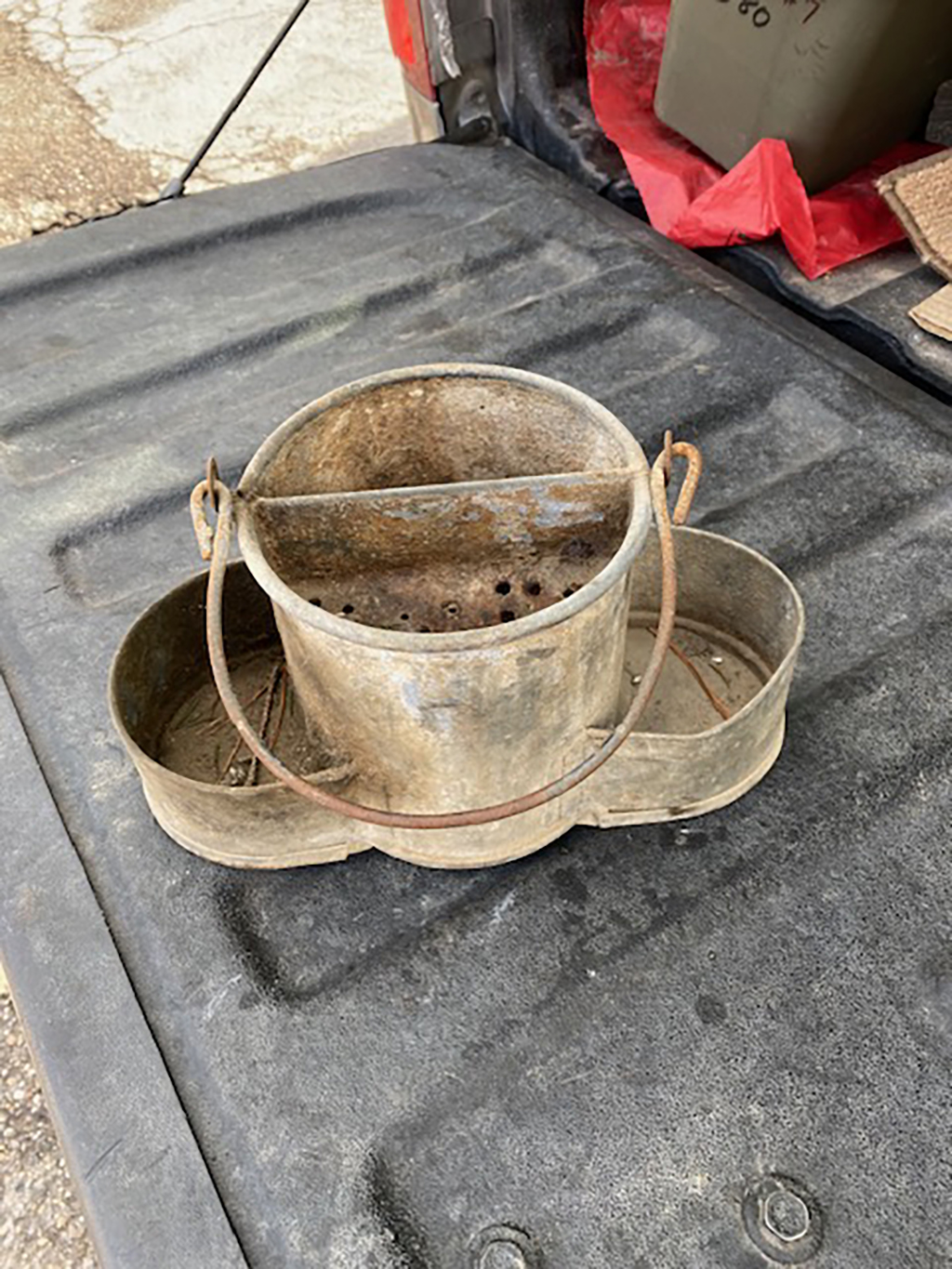 Item No. 1271 was shared with us by Linda Roof, of Sunbury, Ohio, in January. Her husband bought it for her at an auction and she needs help identifying it. It appears to be a metal bucket with some sort of sifting mechanism inside and two small metal semicircle trays attached to either side. It is only about 11 inches tall.