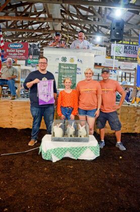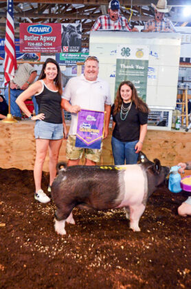 GRAND CHAMPION: Cheyenne Henry | Bid: $3,500 | Buyer: Hampton Mechanical, Inc.; RESERVE CHAMPION: Emersyn Kelley | Bid: $1,600 | Buyer: Saxonburg Feed Company & Sprankel’s Market