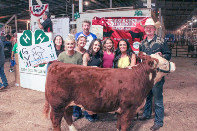 GRAND CHAMPION: Stosh Skoczen | Bid: $5/lb | Weight: 1,400 lbs | Buyer: Creekside Engineering; RESERVE CHAMPION: Cooper Kiser | Bid: $5.90/lb | Weight: 775 lbs | Buyer: Greystone Veterinary Hospital + Urgent Care, Lindsay Kostal, DVM