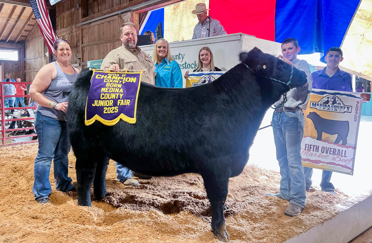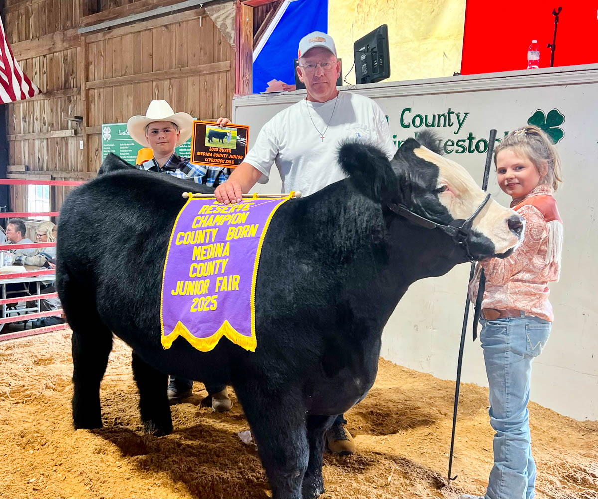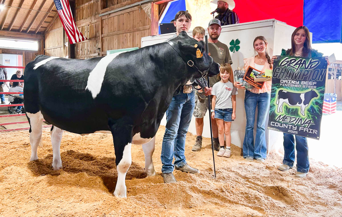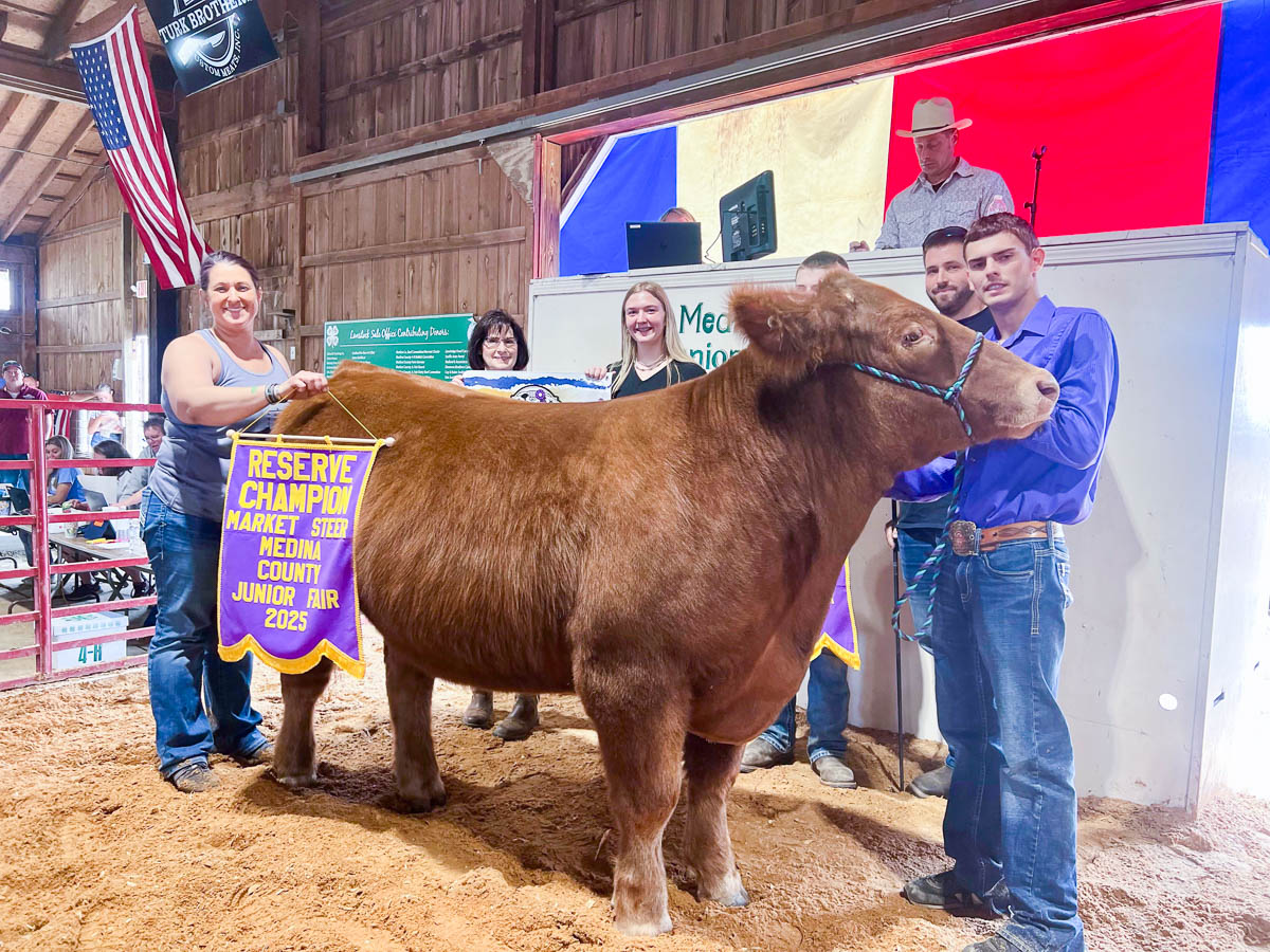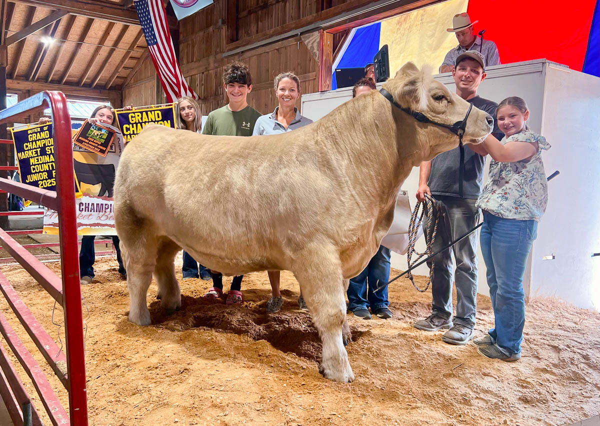 GRAND CHAMPION MARKET BEEF: Kennedy Hagenbaugh | Weight: 1,430 lbs | Total bid $7,500 | Buyer: C&S Lawn Service and Landscape; RESERVE CHAMPION MARKET BEEF: Garrett Reusch | Weight 1,425 lbs | Total bid: $6,500| Buyer: Reusch Diesel LLC, Schaeffer’s Oil and Josh Morlock; GRAND CHAMPION COUNTY BORN BEEF: Garrett Reusch | Weight: 1,545 lbs | Total bid $6,000 | Buyer: Forever Fence & Rai; RESERVE CHAMPION COUNTY BORN BEEF: Josie Ruffing | Weight: 1,280 lbs | Total bid: $5,000 | Buyer: Medina Turf Farms; GRAND CHAMPION CARCASS BEEF: Luke Farnsworth | Weight: 836 lbs | Total bid $6,000 | Buyer: Shaw Trucking & Excavating; RESERVE CHAMPION CARCASS BEEF: Bailee Robinson | Weight: 779 lbs | Total bid: $6,750 | Buyer: Albrecht Trucking