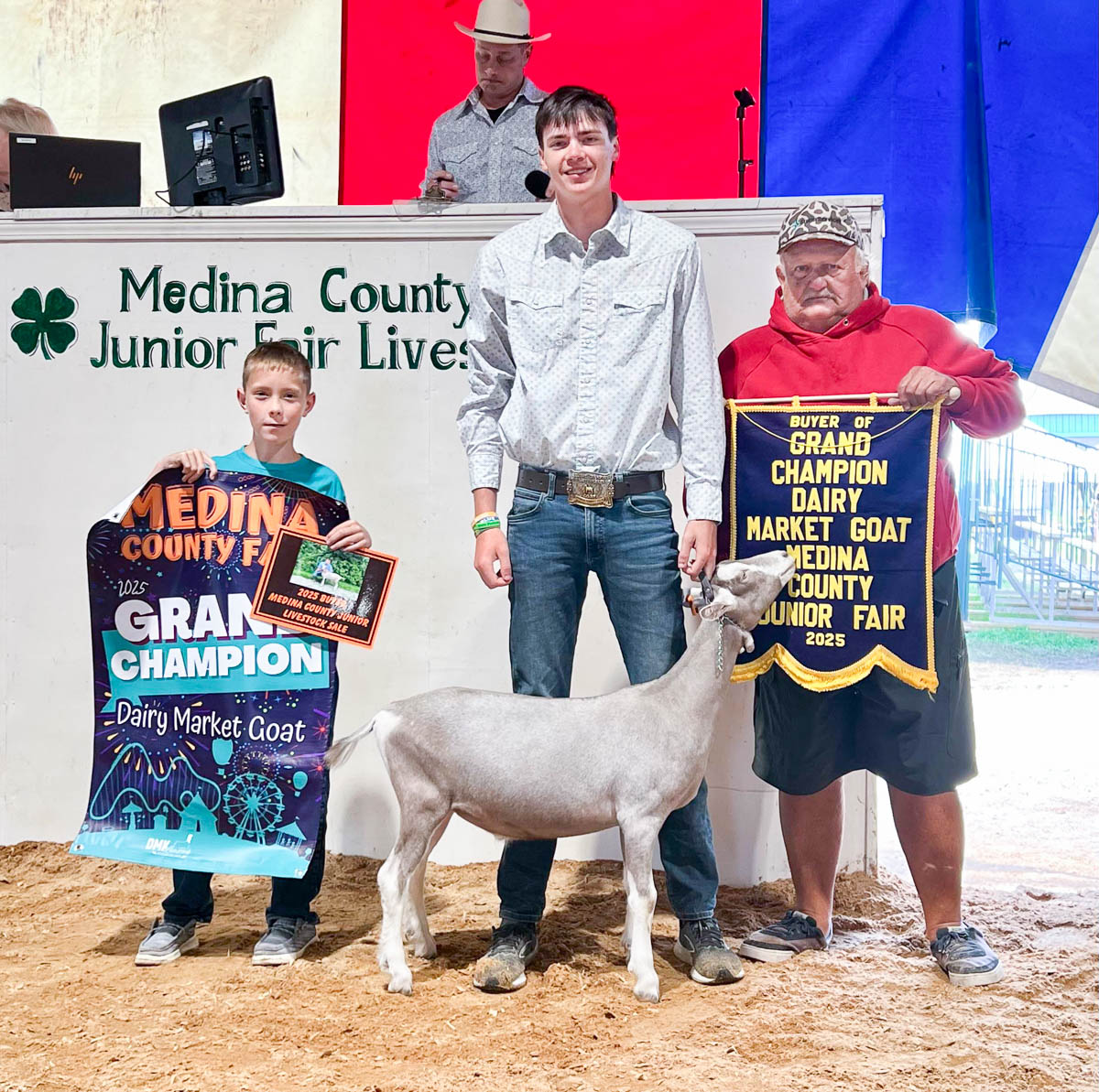 GRAND CHAMPION MARKET DAIRY GOAT: Nicholas Gall | Weight: 76 lbs | Total Bid $1,050 | Buyer: Fairway Electric; RESERVE CHAMPION MARKET DAIRY GOAT: Emmett McCluggage | Weight: 73 lbs | Total bid: $700 | Buyer: Wellington Implement