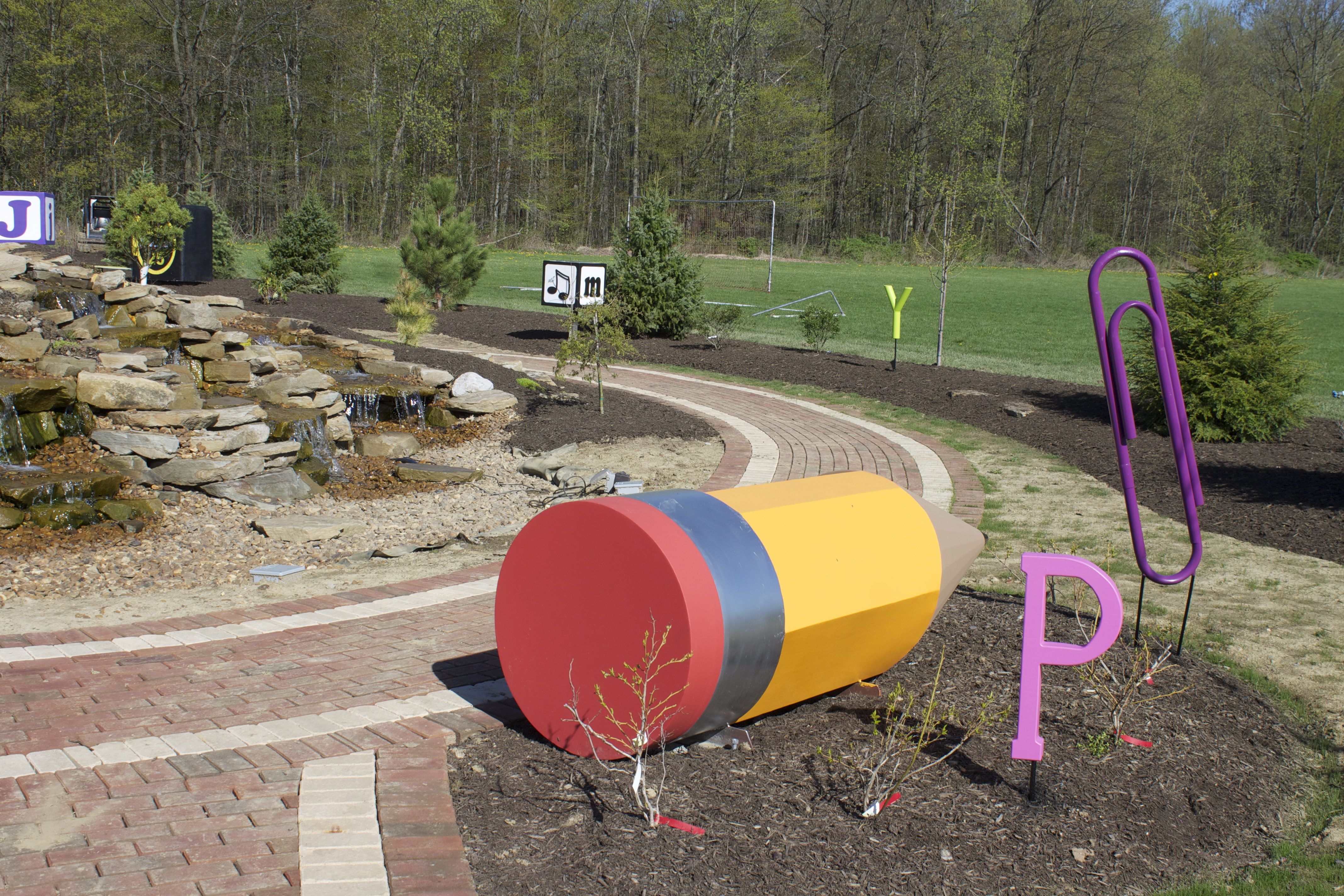 Visitors to the garden will find a student-created waterfall, a pencil that doubles for a bench while visitors sit and enjoy giant crayons that act as a learning tool for students to learn their colors.