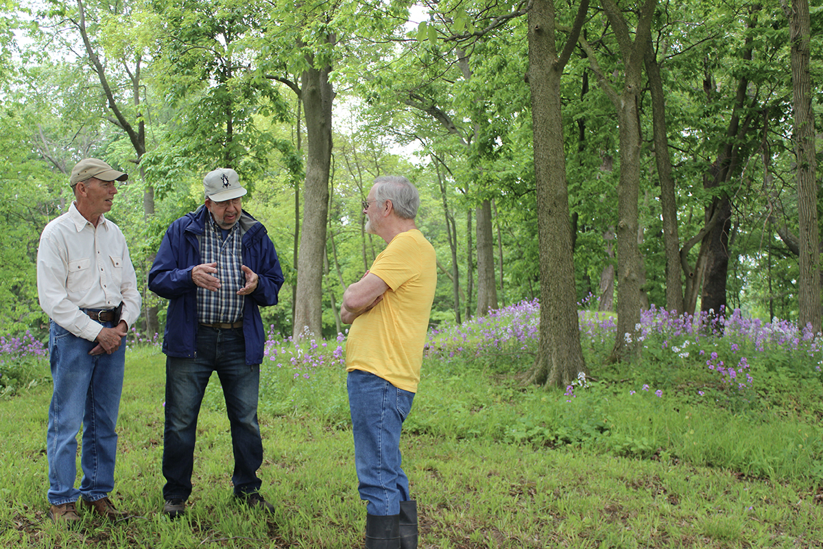 Landowner Dean Barr, geologist Dick McClish and archaeologist Al Tonetti are dedicated to preserving the Snake Den Mounds. One of the mounds is visible in the woods to the right.