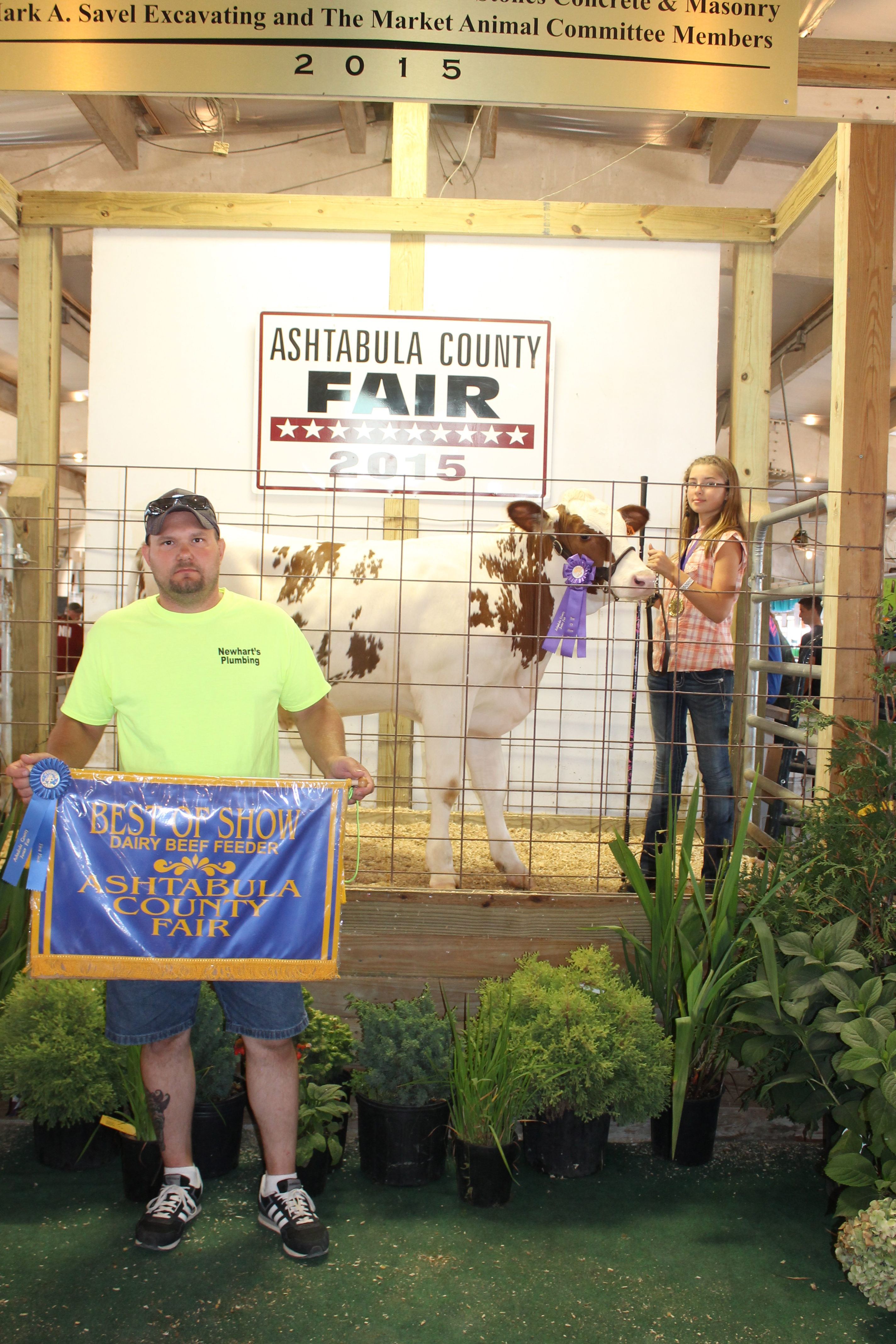 Katelyn Teter had the best of show dairy beef feeder at the Ashtabula County Fair. Her project weighed 752 pounds and sold for $ 1.75 to Newhart Plumbing. Pictured is Michael Newhart.