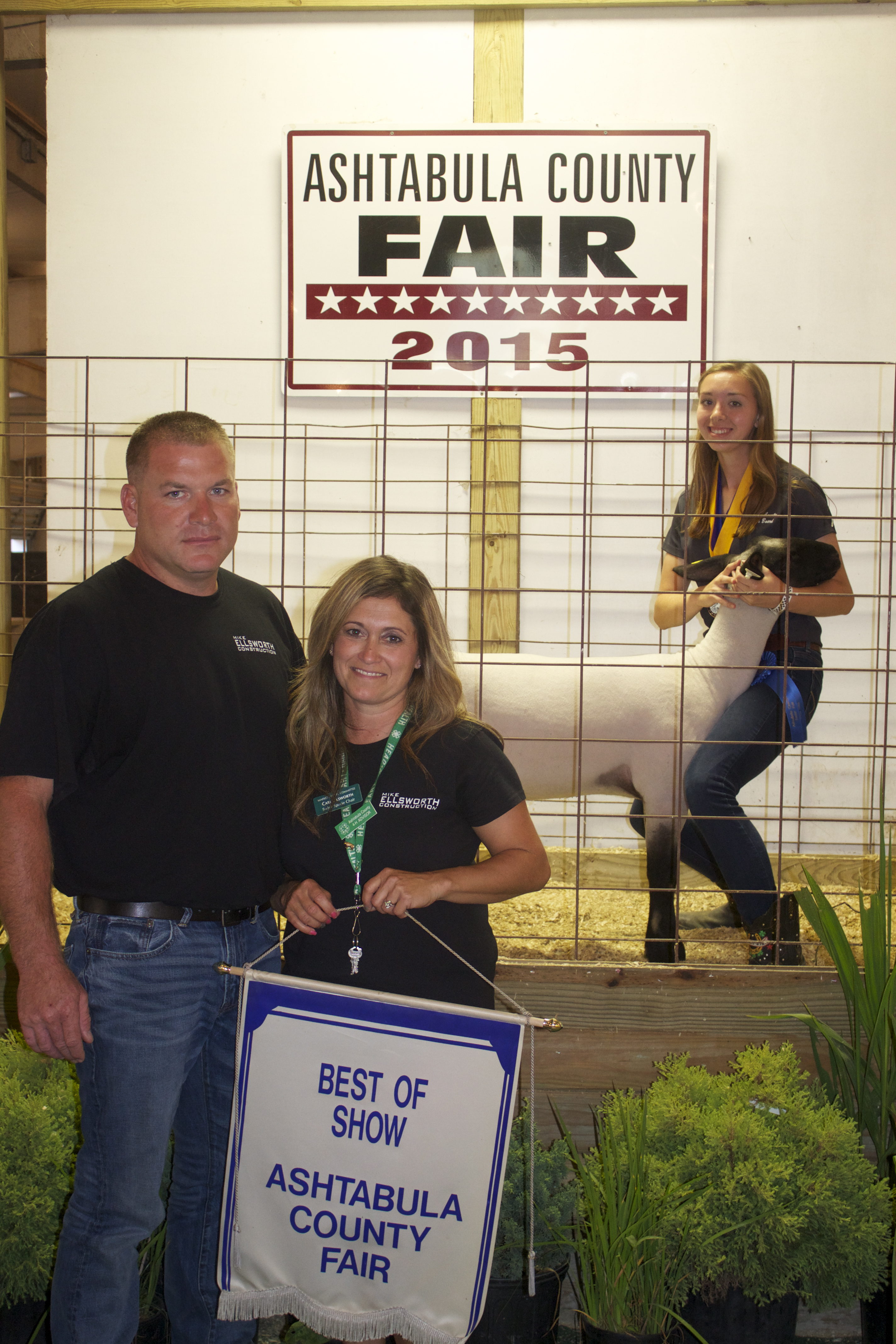 Laura Jackam earned best of show for her lamb at the Ashtabula County Fair. Her lamb weighed 141 pounds and sold for $8 a pound to Mike Ellsworth Construction. Pictured is Mike and Cari Ellsworth. (Kristy Foster Seachrist photos)