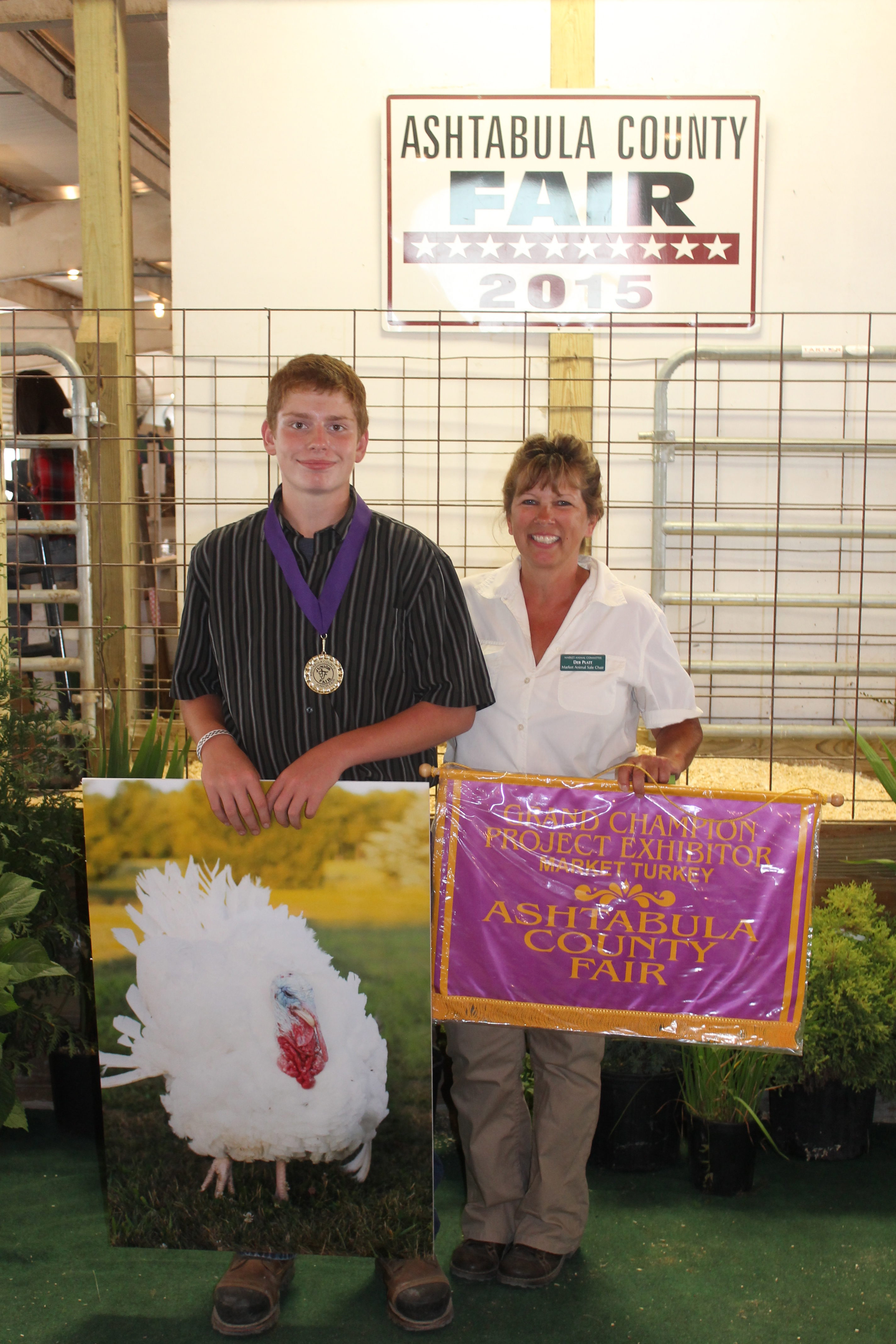 Stuart Struna was this year’s grand champion turkey exhibitor. The turkey weighed 36 pounds and sold for $21 a pound to Country Cape Vacation Rental. Pictured is Deb Platt.