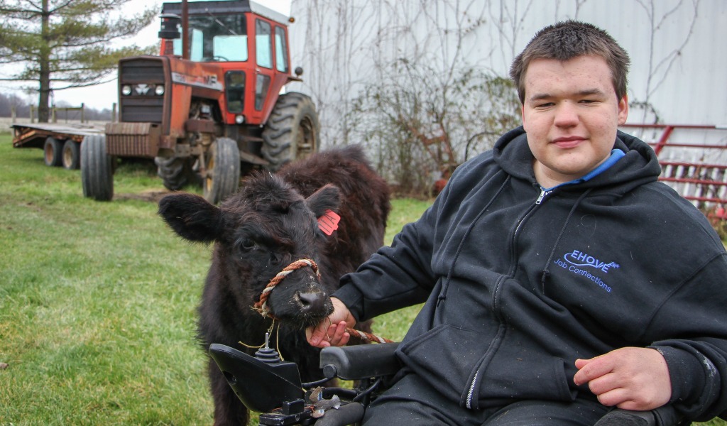 17-year-old Austin Yaworsky has come to realize his disability would make it difficult to pursue grain farming, so the animals are his connection to the farm. Pictured here, with his steer, Steak, Austin’s dream is to get an Action Trackchair to help him get around the family farm better.