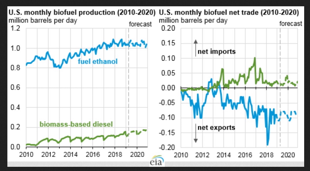 WASHINGTON — In its February 2019 Short-Term Energy Outlook (STEO), EIA forecasts that several recent trends in U.S. biofuels markets will continue through 2020. In the STEO, production of fuel ethanol and net imports of biomass-based diesel stay unchanged, while net exports of fuel ethanol decline modestly.