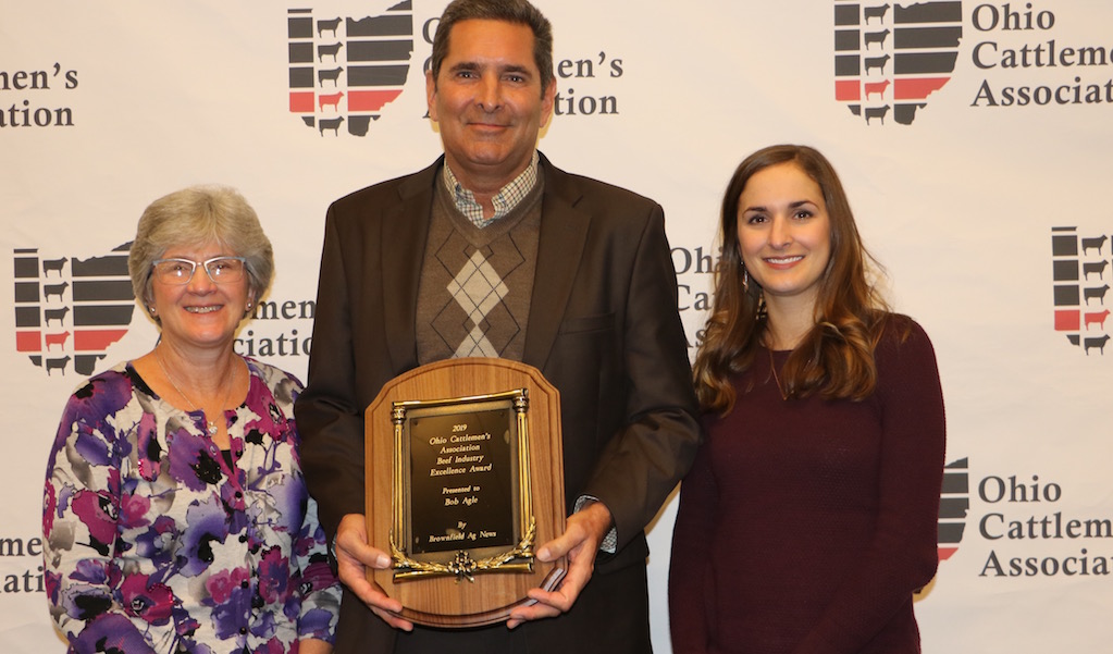 Bob Agle, of Clark County, joined here by his wife Peggy and daughter, Allison Regula, received the Ohio Cattlemen’s Association Industry Excellence Award. (Farm and Dairy/Susan Crowell photo)