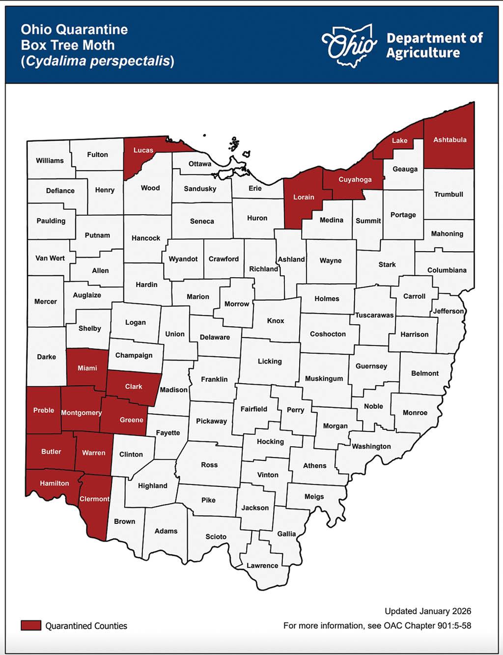 Beginning Jan. 30, the updated quarantine will include Preble, Clark, Cuyahoga, Ashtabula, Lorain, Lake and Lucas in addition to the existing quarantine which includes Miami, Montgomery, Greene, Butler, Clermont, Hamilton and Warren.