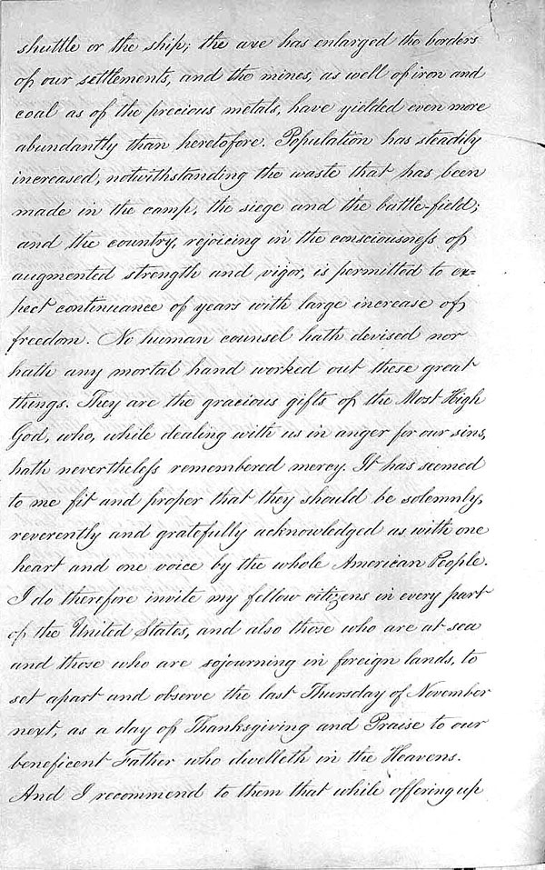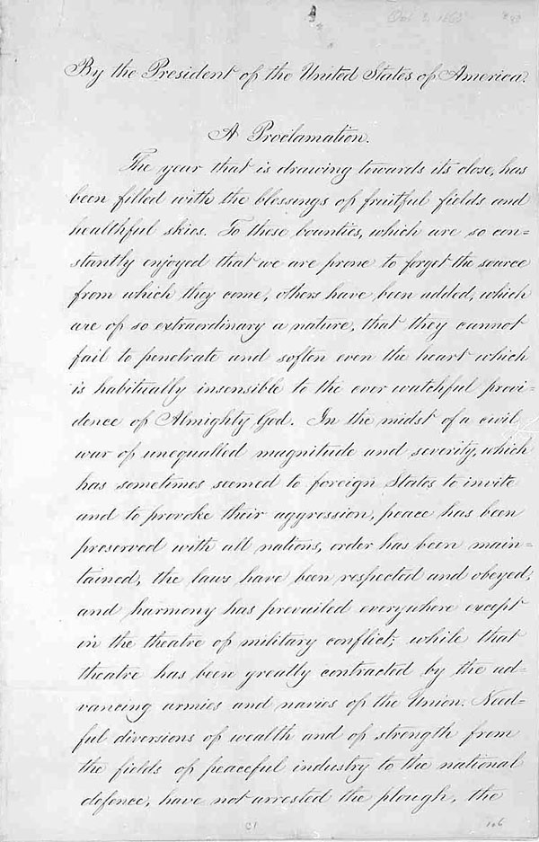 In the midst of a bloody Civil War, President Lincoln issued a Presidential Proclamation in which he enumerated the blessings of the American people and called upon his countrymen to “set apart and observe the last Thursday of November next, as a day of Thanksgiving and Praise.”
