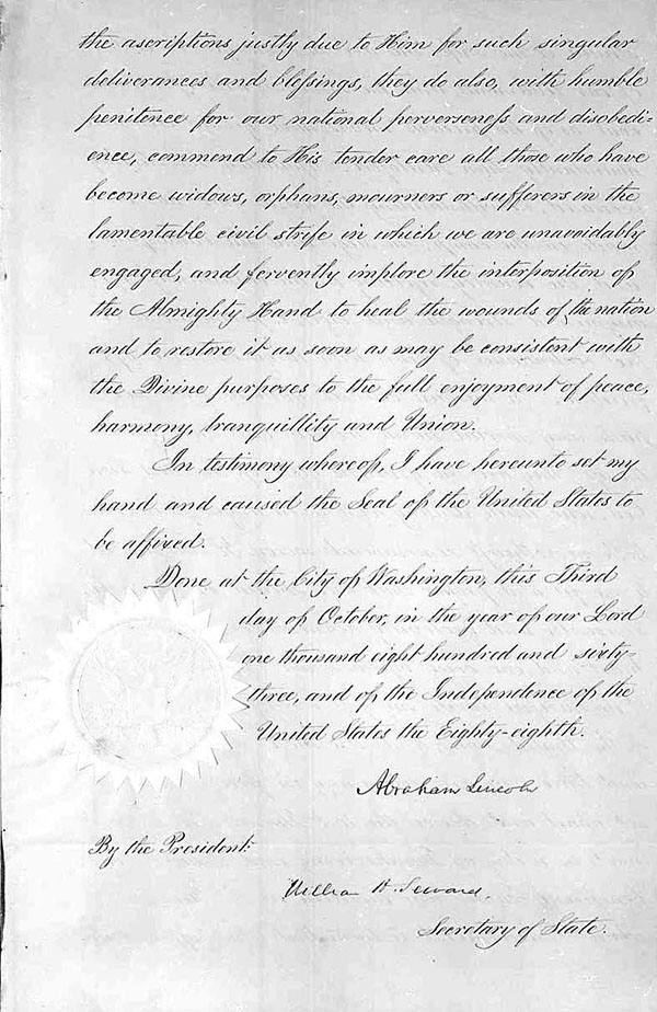 It wasn’t until Oct. 3, 1863, that President Lincoln made the traditional Thanksgiving celebration a nationwide holiday to be commemorated each year on the fourth Thursday of November.